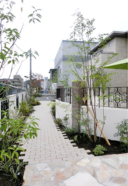 駐車場前のスペースは自然石の色合いを使い、