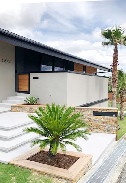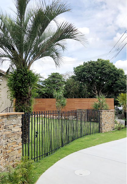 道路に向かって大胆な曲線で、石の壁とオリジナルアイアンフェンスで柔らかな空間をつくり出しました。